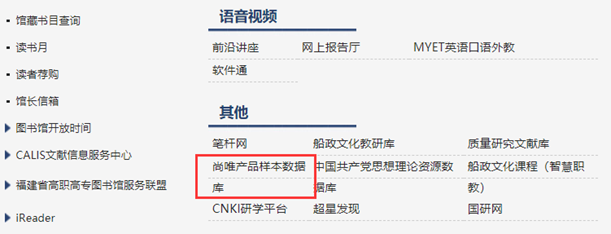 3、圖書館首頁 - > 其他 - > 尚唯產(chǎn)品樣本數(shù)據(jù)庫,找到數(shù)據(jù)庫。
