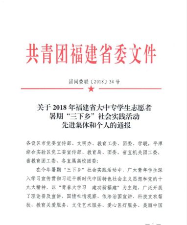 祝賀我館思源志愿隊(duì)在2018暑期三下鄉(xiāng)活動中獲得共青團(tuán)福建省委授予的省級優(yōu)秀團(tuán)隊(duì)榮譽(yù)稱號