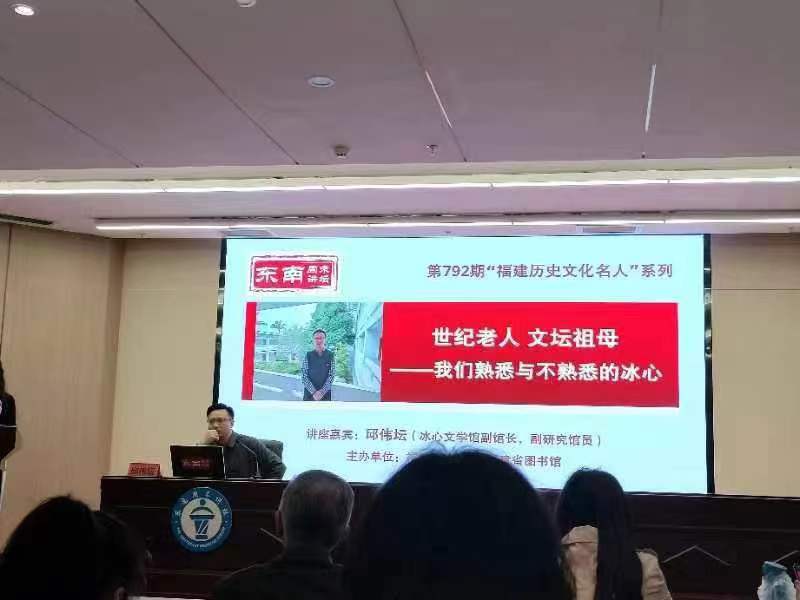 同時,圖學聯(lián)志愿者們還觀摩了福建省圖書館“東南周末講壇”開設(shè)的冰心專題講座,應(yīng)邀了冰心文學館副館長邱偉壇到現(xiàn)場為大家作《世紀老人 文壇祖母——我們熟悉與不熟悉的冰心》的專題講座,吸引了百余名聽眾。