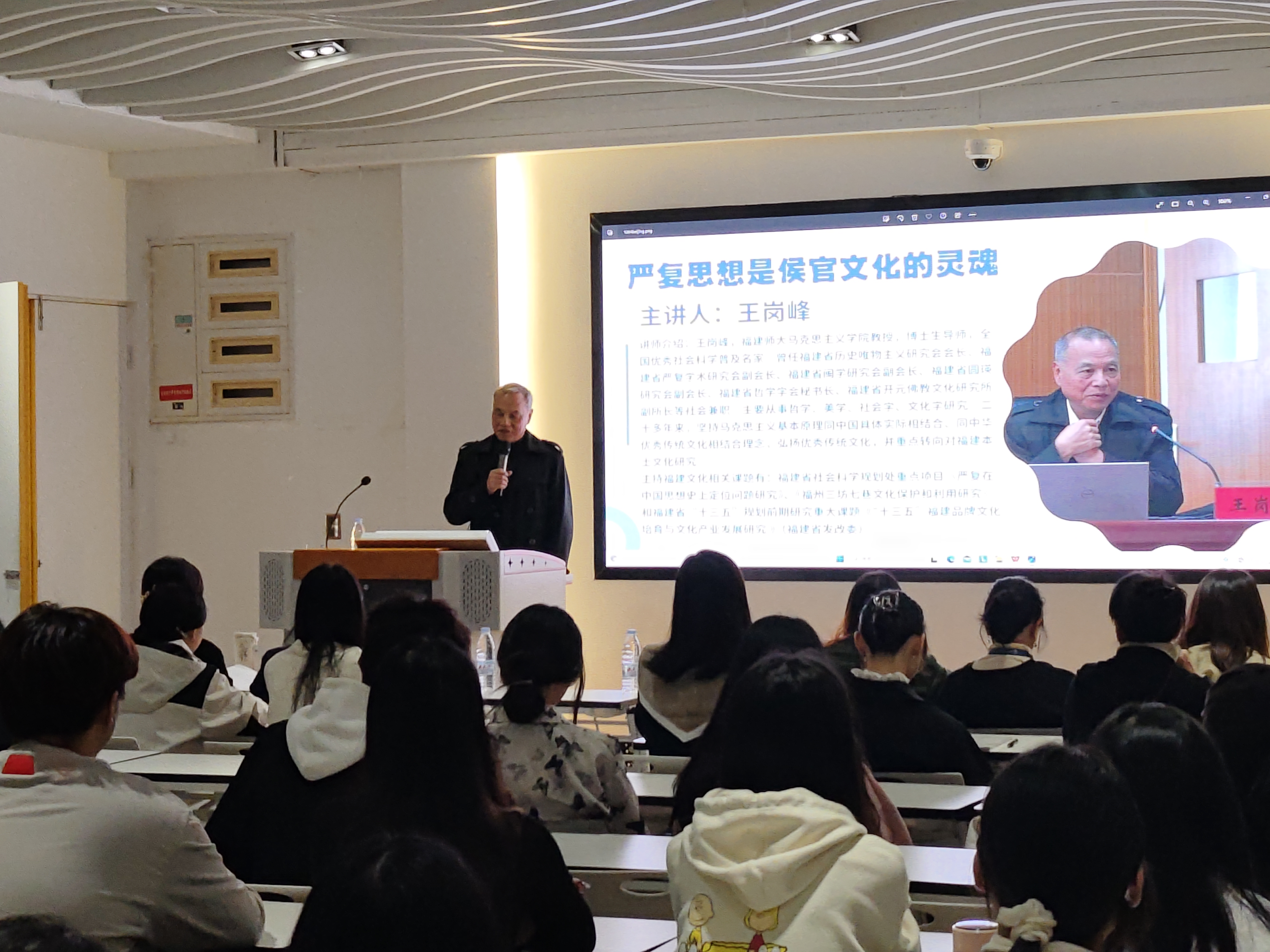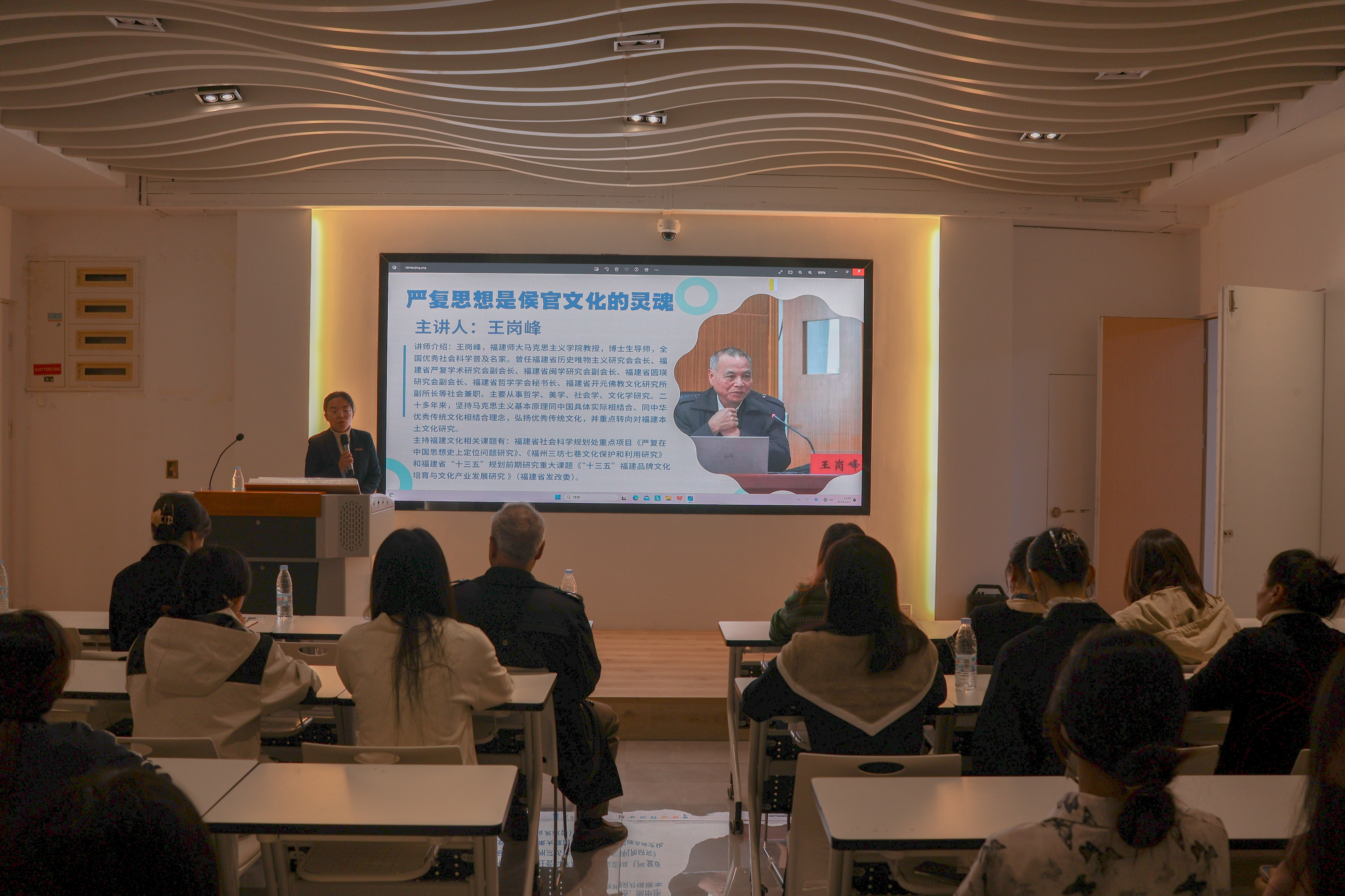 講座由福建師范大學(xué)馬克思主義學(xué)院博士生導(dǎo)師王崗峰教授主講。其內(nèi)容圍繞著閩都文化、侯官文化、閩縣文化和福州文化概念的內(nèi)涵和同異;嚴(yán)復(fù)為核心的福州學(xué)派——“侯官新學(xué)”;研究侯官文化的重要意義等方面展開。王教授詳細(xì)闡述了嚴(yán)復(fù)思想在侯官文化中的靈魂地位。