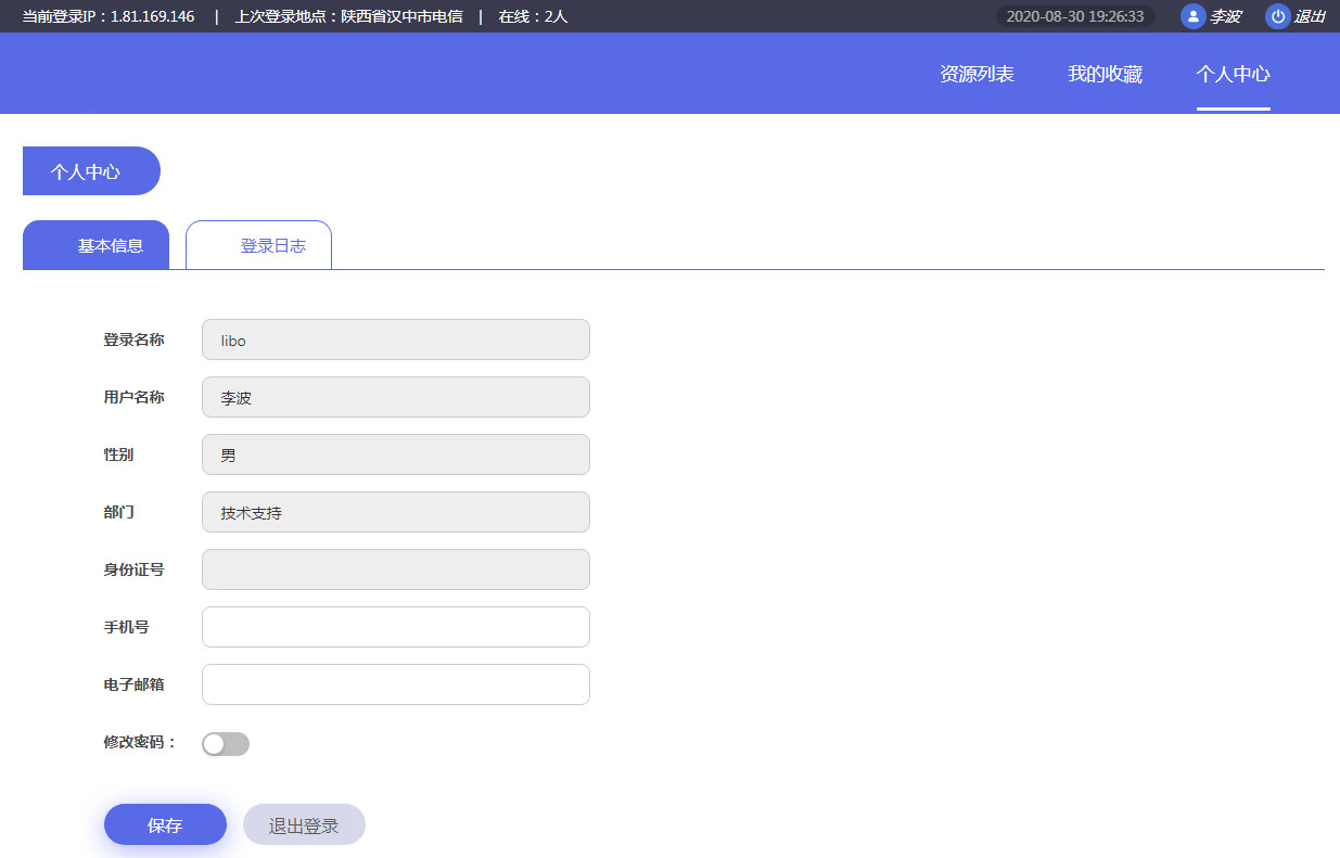 基本信息頁面可以維護(hù)自己的手機(jī)號、郵箱信息,還可以進(jìn)行修改自己的登錄密碼。