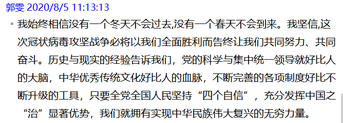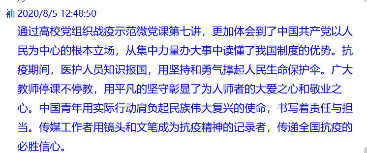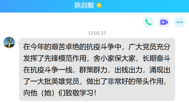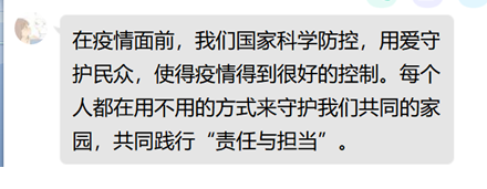 在一個(gè)多小時(shí)的微黨課中,10位主講人用鮮活的事例、權(quán)威的數(shù)據(jù)向我們展示了高校黨組織和廣大師生黨員堅(jiān)定人民至上理念,在疫情防控斗爭(zhēng)中踐行初心使命的優(yōu)秀事跡。這些先進(jìn)事跡深刻詮釋了中國(guó)共產(chǎn)黨人“不忘初心、牢記使命”的執(zhí)著堅(jiān)守,要牢牢把握立德樹(shù)人根本任務(wù),做好常態(tài)化疫情防控工作。