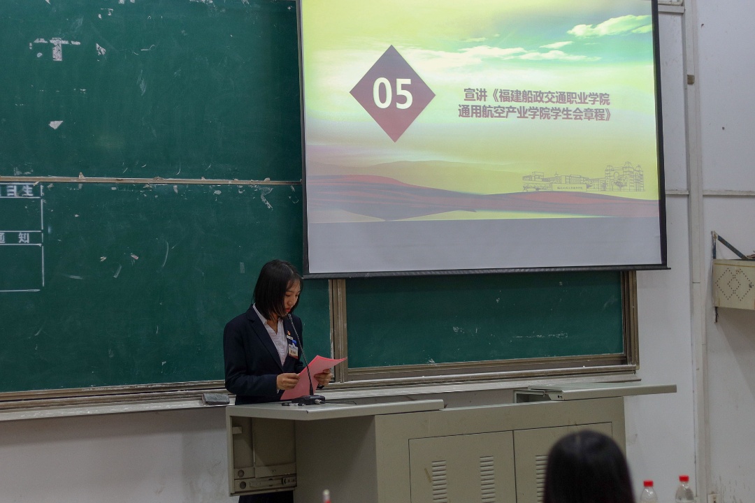 潘靜茹同學(xué)宣讀《福建船政交通職業(yè)學(xué)院通用航空產(chǎn)業(yè)學(xué)院學(xué)生會(huì)章程》(修訂案)