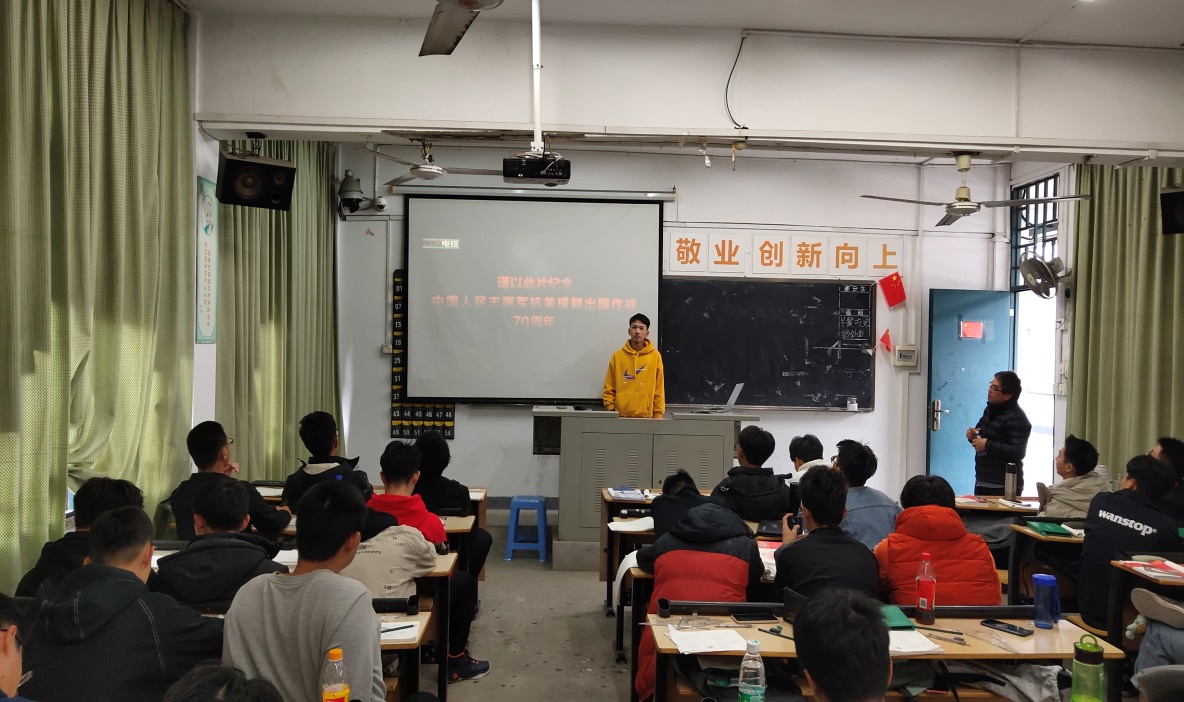 為深入貫徹落實習近平總書記在紀念中國人民志愿軍抗美援朝出國作戰(zhàn)70周年大會上的重要講話精神,深入開展“四史”學習教育,大力弘揚偉大的抗美援朝精神,加強新時代愛國主義教育,教育引導廣大學生厚植愛國主義情懷。12月5日,輔導員范聲斌于8號樓階梯教室,召開主題班會介紹革命傳統、講述英雄事跡、分享個人對于觀看《為了和平》感受,要求學生要銘記抗美援朝戰(zhàn)爭的艱辛歷程和偉大勝利,緬懷先烈的英勇事跡,更要學習前輩的崇高精神,珍惜當下的和平生活,牢記使命和責任,與學生共情、共鳴、共振。