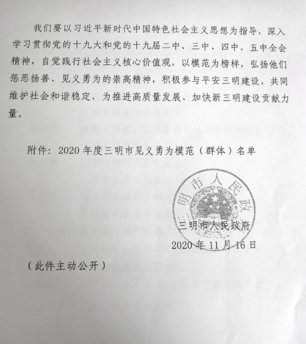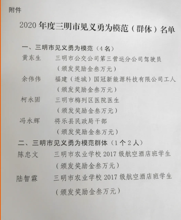 陳忠文和陸智霖勇制歹徒的英勇行為受到當(dāng)?shù)刭潛P(yáng),陳忠文和陸智霖同學(xué)被評為“2020年度三明市見義勇為模范群體”。他們受邀參加了2019-2020年度見義勇為表彰大會,《三明農(nóng)校青年之聲》對他們的事跡進(jìn)行了報(bào)道。