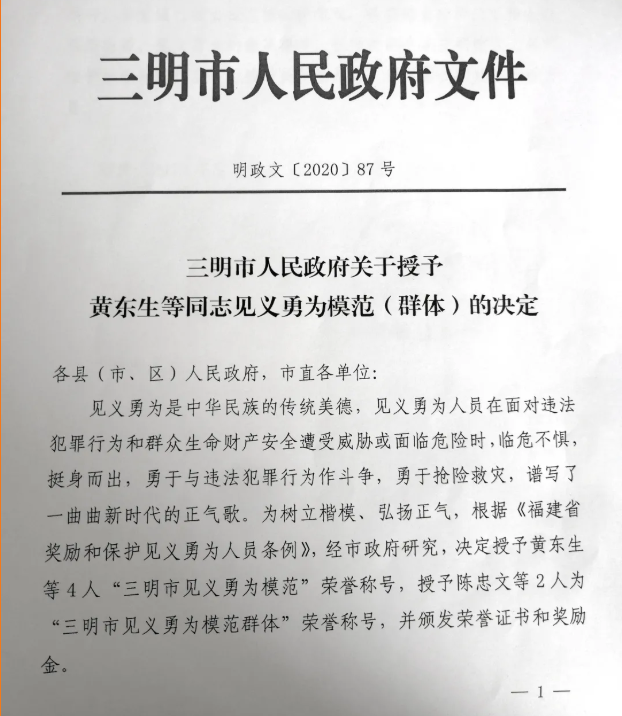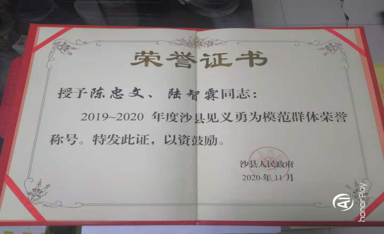 20191011日,沙縣某山莊發(fā)生傷人事件,陳忠文和陸智霖不顧個(gè)人安危,全力搜尋并阻止企圖逃跑的歹徒,陳忠文腹部被打傷,陸智霖手臂被劃破,用盡力氣共制歹徒,直至警車到達(dá)現(xiàn)場。危急關(guān)頭,他們挺身而出,面對窮兇極惡的歹徒,他們不懼危險(xiǎn),用沉著冷靜和堅(jiān)毅勇敢詮釋了什么是英勇無畏,他們用實(shí)際行動保護(hù)了人民群眾的安全,弘揚(yáng)社會正能量。