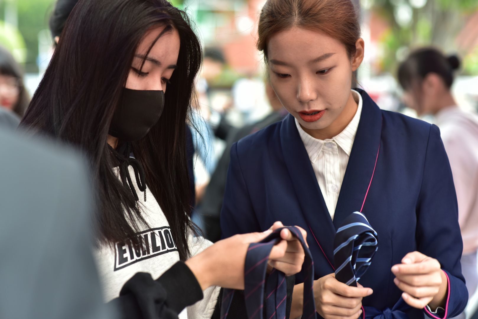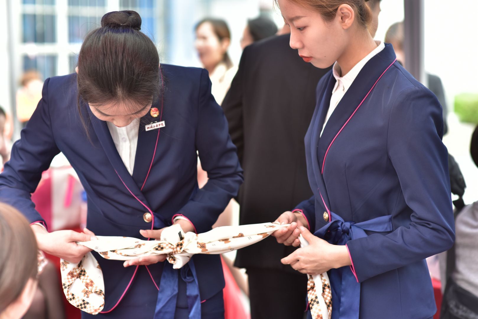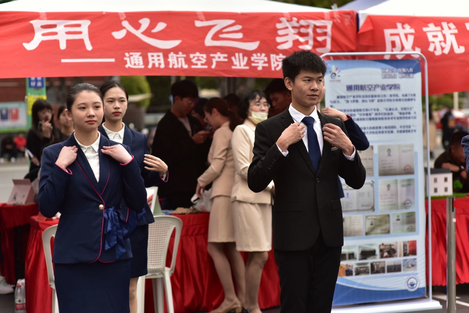 在現(xiàn)場,空乘專業(yè)的師生們搭建了化妝工位、發(fā)型塑造工位、絲巾工位、領(lǐng)帶工位,通過絲絲入扣教現(xiàn)場的來賓絲帶的配搭技巧,紳士酒窩來教授如何正確的進行系領(lǐng)帶,青絲萬縷幫來賓們盤發(fā),告訴來賓如何更好的打理自己的發(fā)型,展示自己,濃妝淡抹是當天最受歡迎的展臺,絡(luò)繹不絕的來賓到這里學(xué)習(xí)在職場在生活中,如何得體的化妝,展示更好的自己。