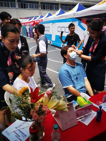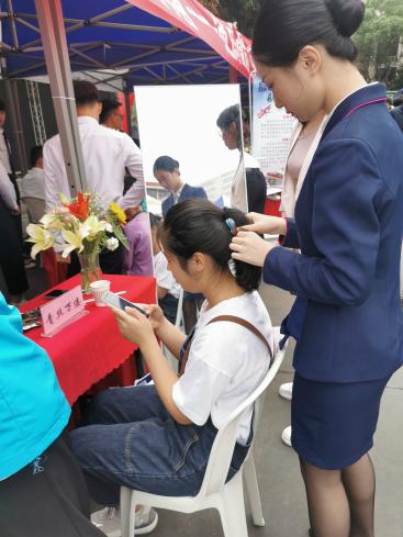 在現(xiàn)場,空乘專業(yè)的師生們搭建了化妝工位、發(fā)型塑造工位、絲巾工位、領(lǐng)帶工位,通過絲絲入扣教現(xiàn)場的來賓絲帶的配搭技巧,紳士酒窩來教授如何正確的進(jìn)行系領(lǐng)帶,青絲萬縷幫來賓們盤發(fā),告訴來賓如何更好的打理自己的發(fā)型,展示自己,濃妝淡抹是當(dāng)天最受歡迎的展臺(tái),絡(luò)繹不絕的來賓到這里學(xué)習(xí)在職場在生活中,如何得體的化妝,展示更好的自己。