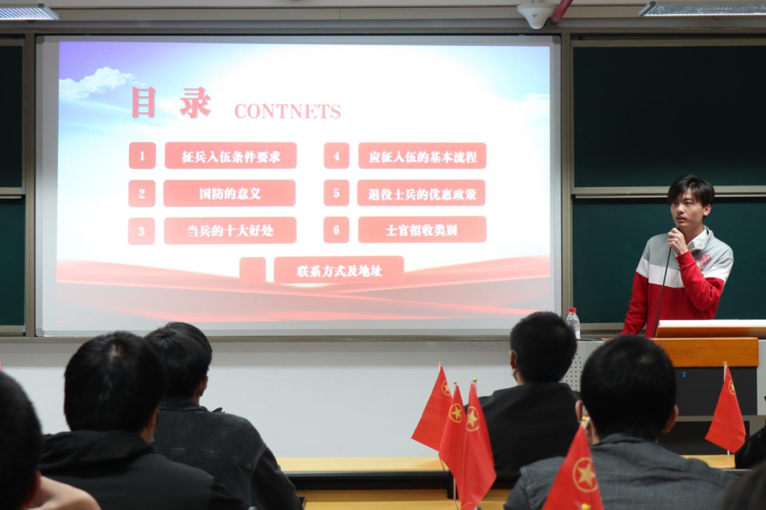 宣講會中主持人帶領同學們了解征兵方面的小知識。從征兵入伍需具備的條件及要求;應征入伍報名的基本操作流程;退役士兵的優(yōu)惠政策;建設強大國防的意義以及大學生如何選擇適合自己入伍的方式等幾個方面為同學們講解。