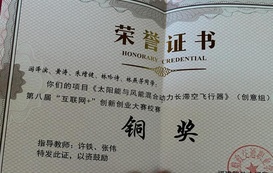 社團成員出于對航空器的熱愛,以解決航空器動能不足的問題為出發(fā)點,自主設(shè)計研發(fā)太陽能與風能混合動力的飛行器,參加院?;ヂ?lián)網(wǎng)+創(chuàng)新創(chuàng)業(yè)大賽。取得優(yōu)秀名次。