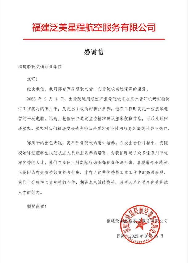 近日,福建船政交通職業(yè)學院通用航空航空產(chǎn)業(yè)學院收到福建泛美星程航空服務有限公司的感謝信,高度贊揚我院實習生陳川平在泉州晉江機場安檢崗位的突出表現(xiàn)。信中提及,陳川平在執(zhí)勤時發(fā)現(xiàn)旅客遺失的平板電腦后,迅速通過監(jiān)控鎖定失主并高效歸還,其專業(yè)素養(yǎng)與責任意識獲得企業(yè)及旅客一致認可。企業(yè)充分肯定我院“產(chǎn)教融合、德技并修”的育人理念,認為此類優(yōu)秀案例是校企協(xié)同育人成果的直接體現(xiàn)。