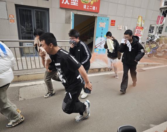 通過校園內(nèi)警報聲驟然響起,各宿舍樓的學(xué)生在老師和工作人員的引導(dǎo)下,迅速用濕毛巾捂住口鼻,低姿前行,沿著預(yù)定的疏散路線有序撤離。整個過程緊張有序,全體參演學(xué)生就安全疏散至學(xué)校操場的指定區(qū)域。