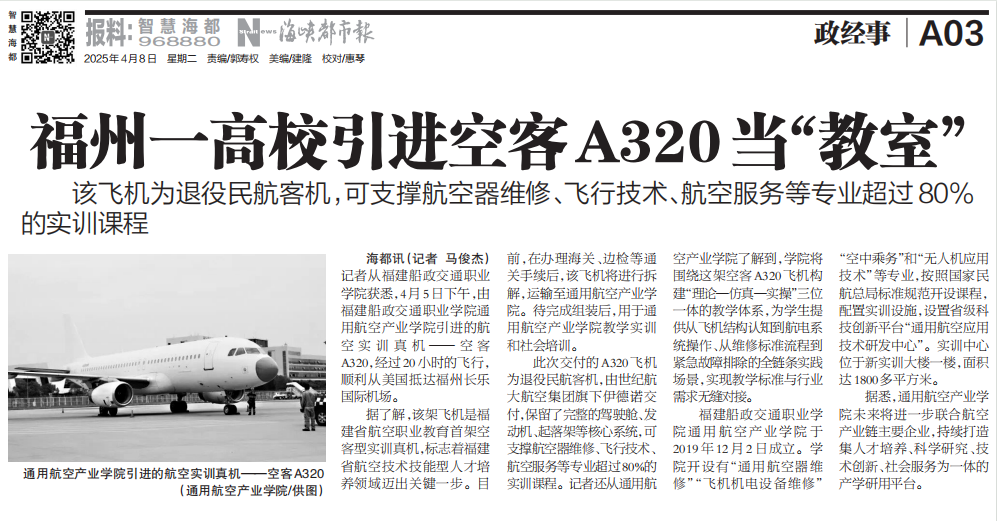4月8日,海峽都市報(bào)報(bào)道我院引進(jìn)空客A320當(dāng)“教室”,原文如下:
