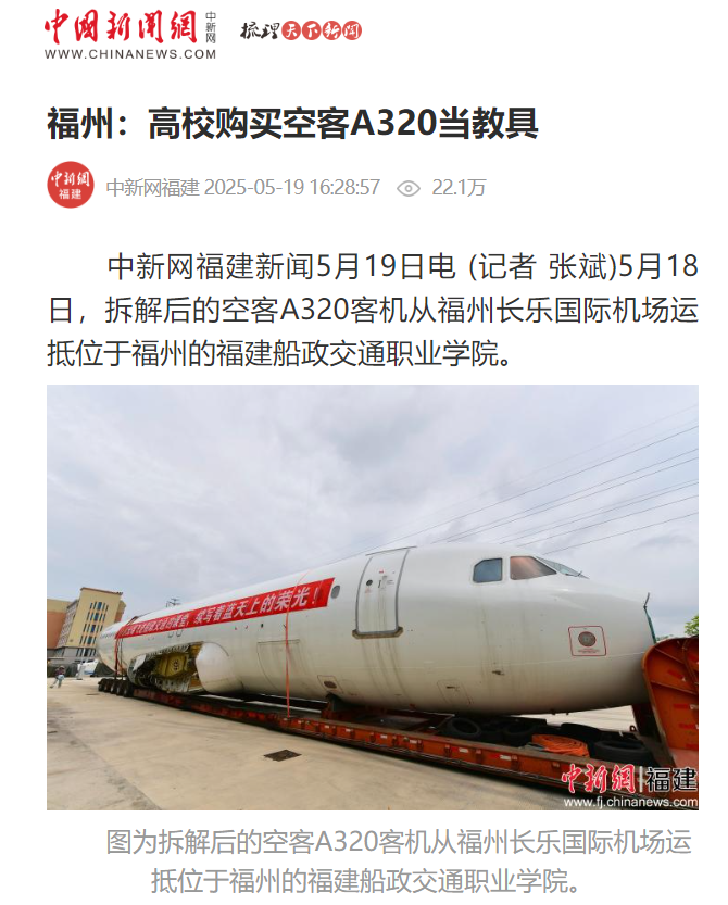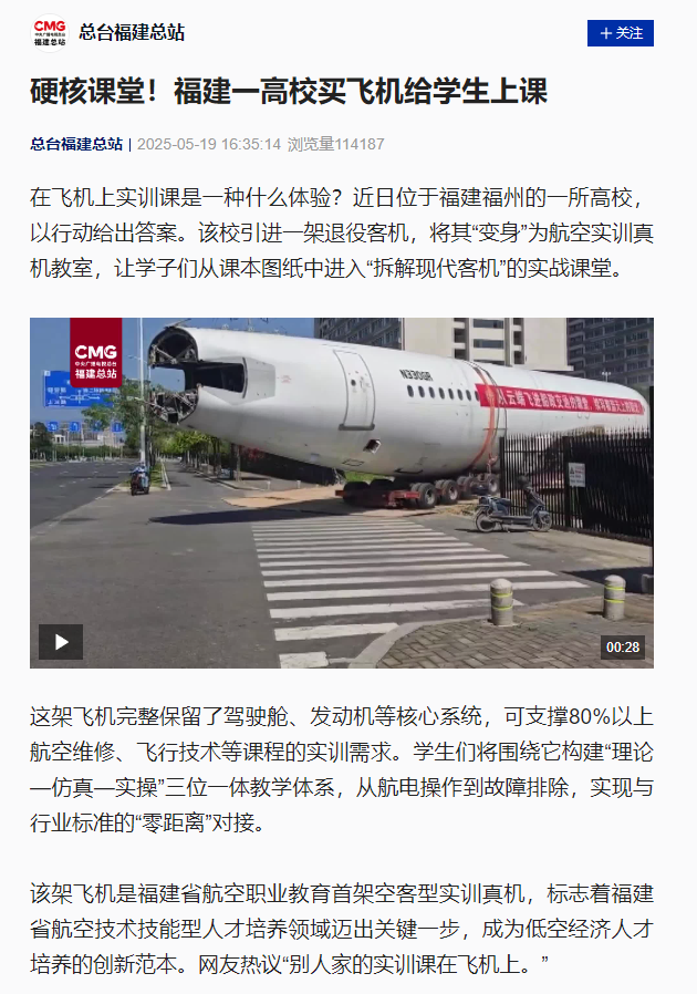 該架飛機(jī)是福建省航空職業(yè)教育首架空客型實(shí)訓(xùn)真機(jī),標(biāo)志著福建省航空技術(shù)技能型人才培養(yǎng)領(lǐng)域邁出關(guān)鍵一步,成為低空經(jīng)濟(jì)人才培養(yǎng)的創(chuàng)新范本。網(wǎng)友熱議“別人家的實(shí)訓(xùn)課在飛機(jī)上?!?/span>