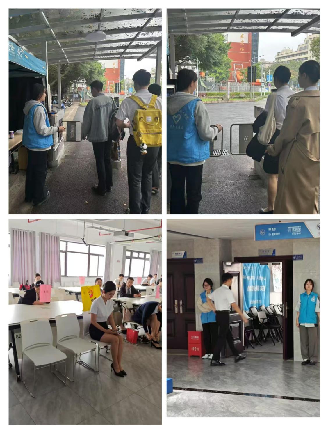 面試當(dāng)天,志愿者們早早到達(dá)現(xiàn)場集合,為其進(jìn)行分組。一組于校門口負(fù)責(zé)人員核驗,為無校內(nèi)人臉信息的面試人員幫助其刷臉,讓其進(jìn)入,同時嚴(yán)格排查非面試人員,禁止其進(jìn)入校園;另一組在面試樓層,引導(dǎo)已通過核驗的面試人員前往指定區(qū)域,并協(xié)助面試官準(zhǔn)備材料、調(diào)試設(shè)備,保障面試全程高效、安全、有序。