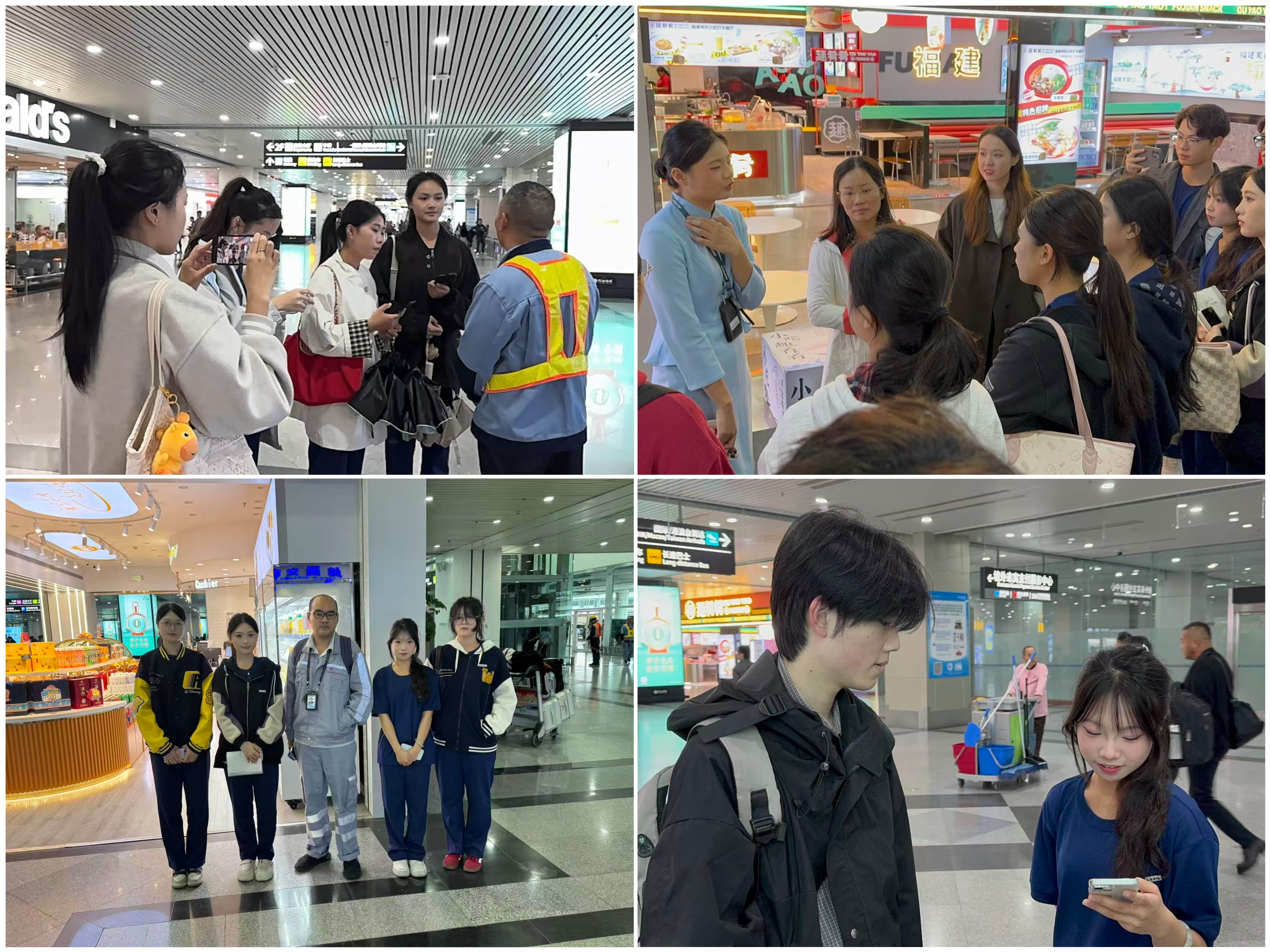 在 9:30 至 10:30 的現(xiàn)場觀察環(huán)節(jié),各小組在值機(jī)島、問詢臺、安檢入口等指定區(qū)域,細(xì)致記錄旅客流動(dòng)路線、服務(wù)設(shè)施布局及一線員工工作狀態(tài),直觀感受機(jī)場運(yùn)作的有序高效。隨后的訪談?wù){(diào)研中,同學(xué)們鼓足勇氣,禮貌征得受訪者同意后,分別對不同背景的旅客和機(jī)場員工展開交流。面對旅客,他們圍繞出行體驗(yàn)、設(shè)施使用感受及對空乘人員的期望等問題虛心請教;遇到問詢員、值機(jī)員等在崗員工時(shí),則重點(diǎn)了解崗位職責(zé)、職業(yè)素養(yǎng)要求及應(yīng)急處置技巧,部分小組還在同意前提下進(jìn)行了視頻記錄。