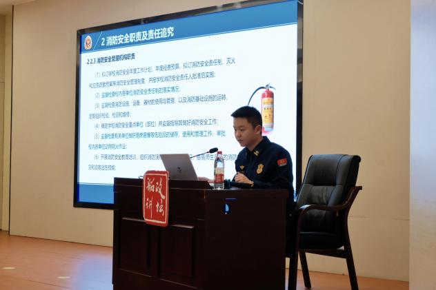 丁偉濱還結(jié)合自身在消防救援領(lǐng)域的實(shí)踐經(jīng)歷,圍繞“校園消防安全形勢分析”“消防安全職責(zé)及責(zé)任追究”“常見隱患問題及整治措施”“初期火災(zāi)撲救和應(yīng)急能力建設(shè)”四大模塊,通過真實(shí)案例、數(shù)據(jù)統(tǒng)計(jì)與視頻警示,深入淺出地講解了火災(zāi)預(yù)防、責(zé)任落實(shí)、隱患整治及應(yīng)急自救等關(guān)鍵知識,強(qiáng)調(diào)了“預(yù)防為主、防消結(jié)合”的消防安全理念。