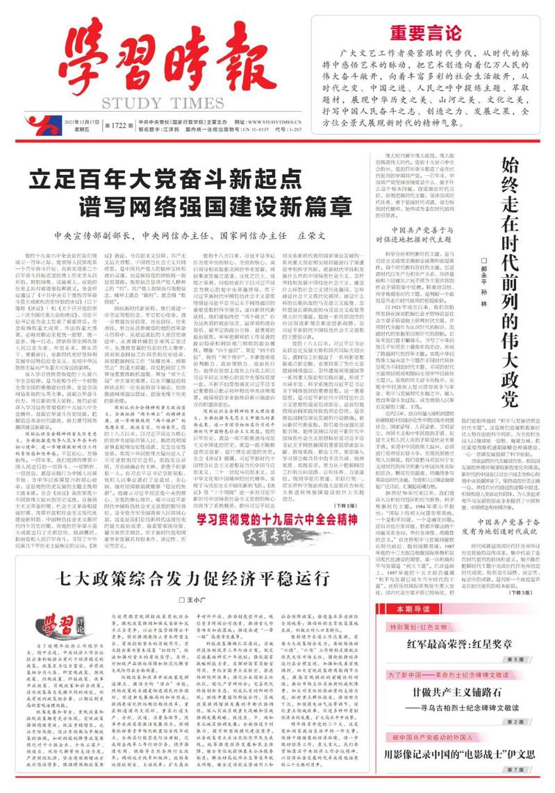 12月17日,中共中央黨?!秾W習時報》在頭版頭條刊發(fā)中央宣傳部副部長、中央網絡安全和信息化委員會辦公室主任、國家互聯網信息辦公室主任莊榮文署名文章。轉發(fā)如下: