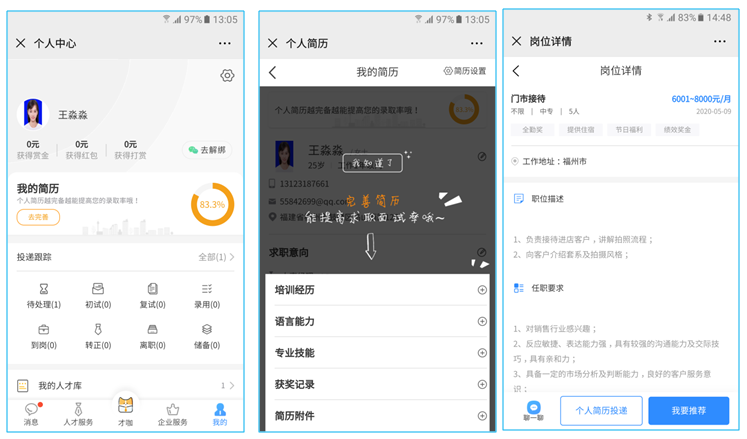 1. 點(diǎn)“我的簡(jiǎn)歷”→填寫具體信息→進(jìn)行在線個(gè)人簡(jiǎn)歷投遞