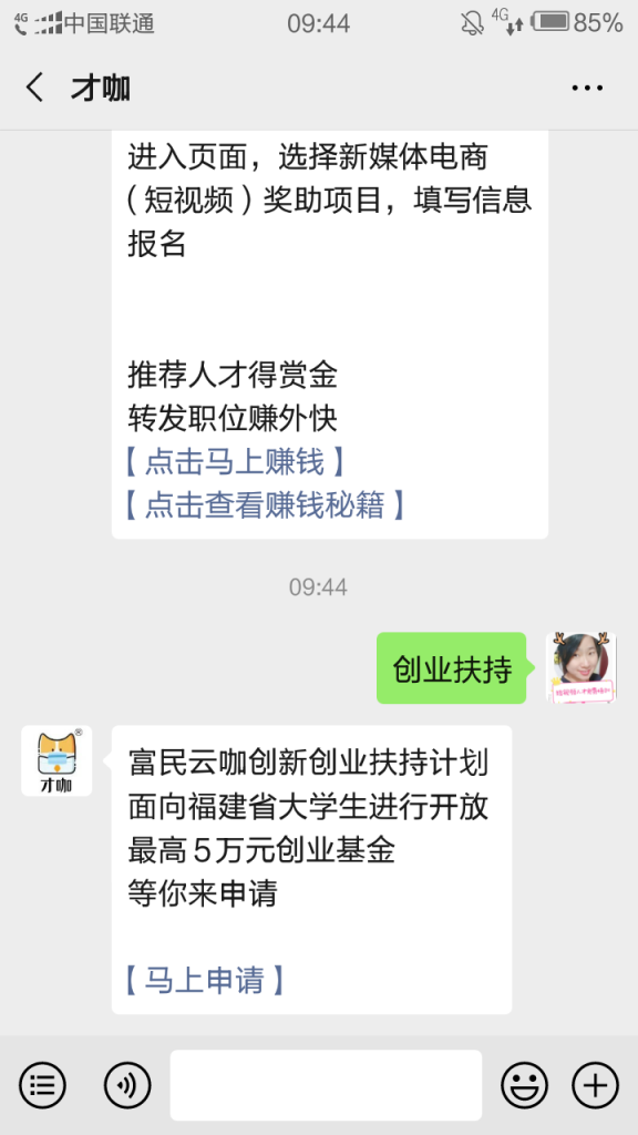 (2)申請(qǐng)方式:關(guān)注“才咖”公眾號(hào)(微信號(hào):caika007,發(fā)送關(guān)鍵字“創(chuàng)業(yè)扶持”,點(diǎn)“馬上申請(qǐng)”,提交創(chuàng)業(yè)項(xiàng)目申請(qǐng)。