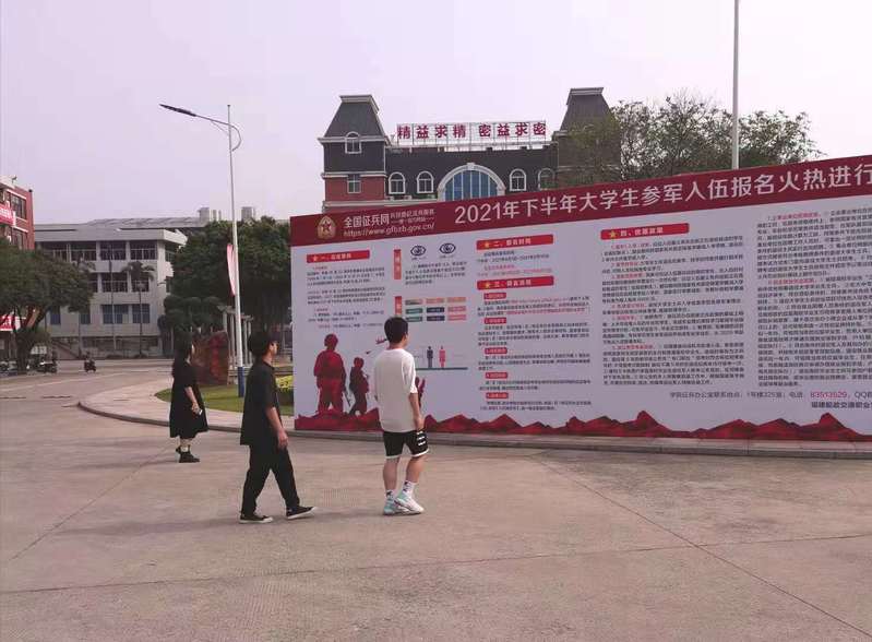 在校園主干道擺放巨幅宣傳牌,公布本次征兵主要政策、報(bào)名流程等,用激情四射的圖文號召大家“畢業(yè)了,當(dāng)兵去!”同樣的內(nèi)容制作成宣傳冊,通過微信公眾號、班級微信群、QQ群等多種形式、渠道傳遞給同學(xué)們。征兵工作站開通熱線電話,隨時(shí)接受咨詢。