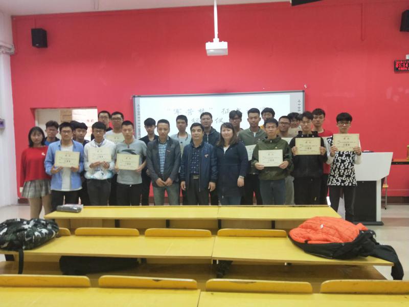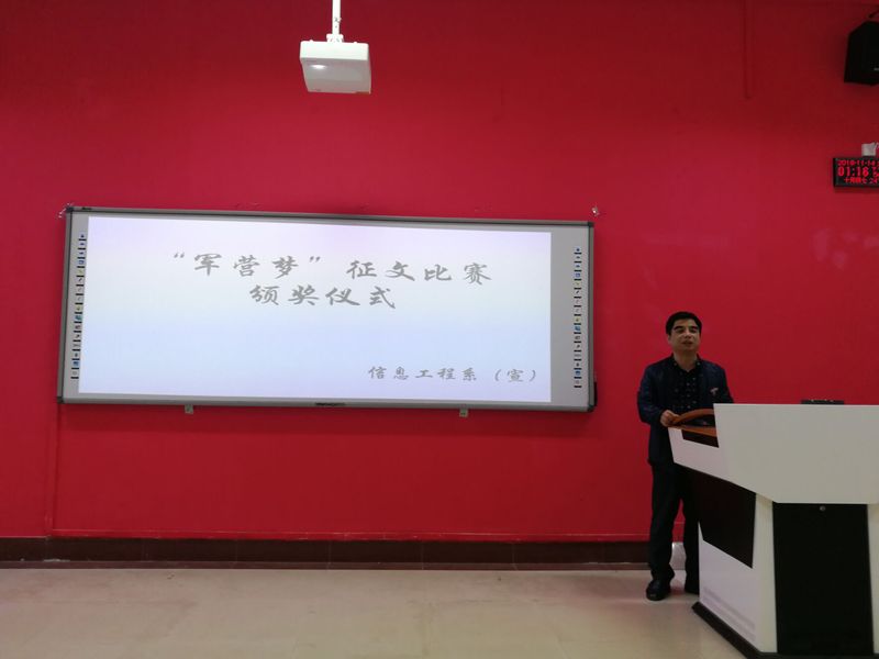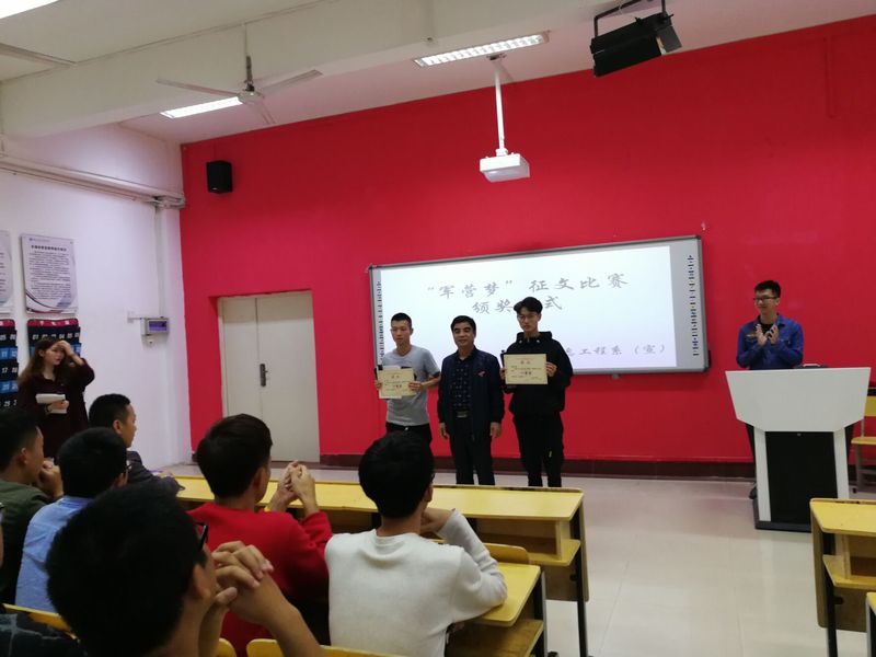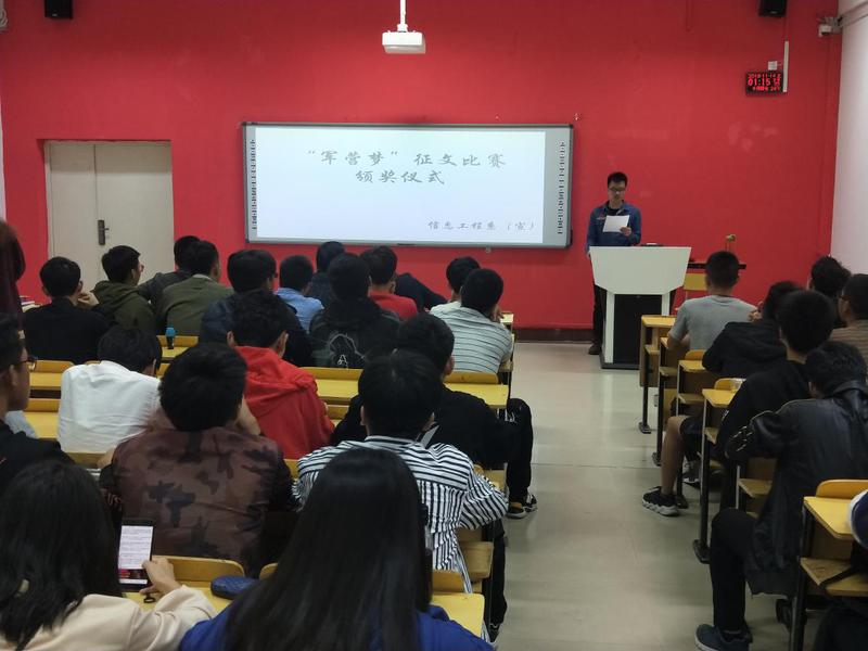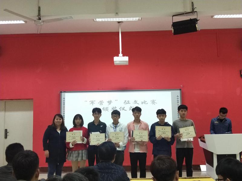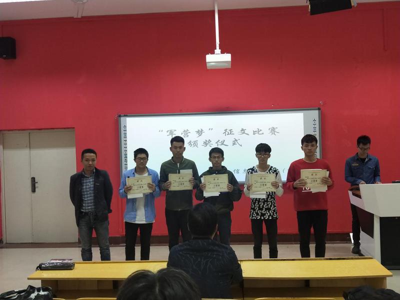 為弘揚愛國主義精神,營造愛國熱情的學(xué)院風(fēng)范。2018年11月14日下午13:00在船政北區(qū)2#1-5舉行了“軍營夢”征文比賽頒獎儀式。信息系系書記孫基老師、征兵負責(zé)人唐曉軍老師以及“軍營夢”征文比賽負責(zé)人2017級輔導(dǎo)員黃華梅老師。本次頒獎儀式由2017級電信班唐宋杰主持。