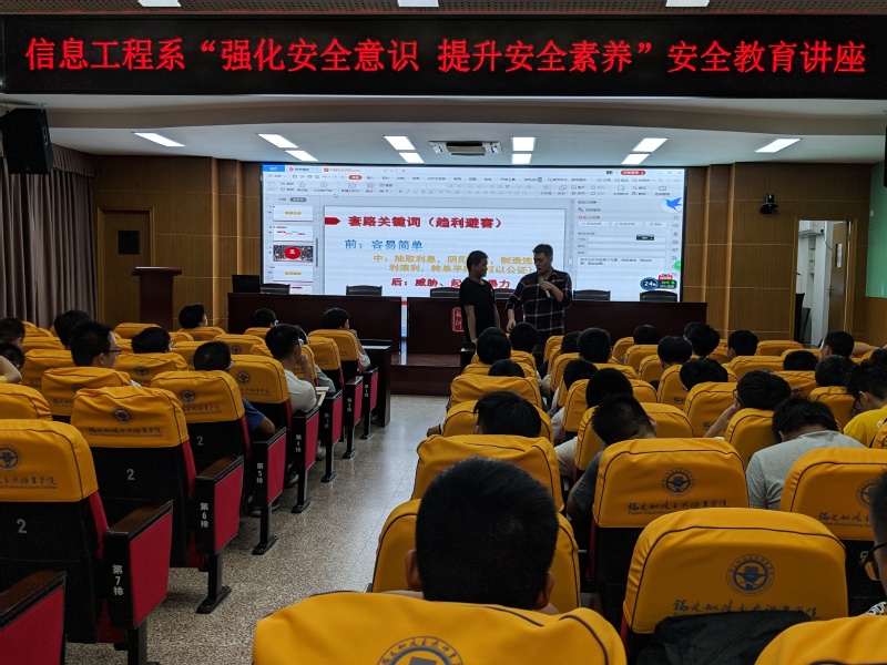 10月17日晚上,信息工程系邀請(qǐng)福州市公安局洪濱警官為我系2019級(jí)新生帶來(lái)校園安全專題教育講座。此次講座為增強(qiáng)大學(xué)生的安全意識(shí),提升安全素養(yǎng),向新生普及安全常識(shí)和常見(jiàn)安全問(wèn)題。