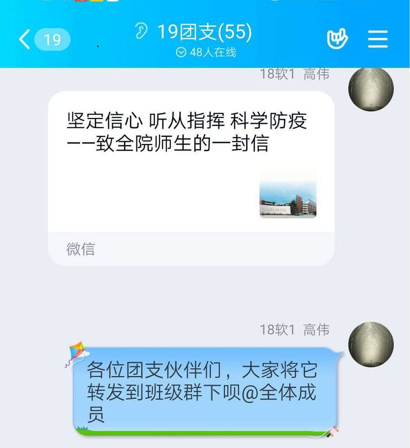 一個團員一個火苗,信息系團總支充分發(fā)揮青年團員干部的作用,堅持做到守土有責,守土擔責、守土盡責。系部實行疫情“零報告”“日報告”制度,分類分層建立工作群,要求每天精準摸排每個學生健康狀況及動態(tài)。各團支部干部在接到團總支、輔導員處下發(fā)的任務后,第一時間明確分工,實行“分配包干”制度,化整為零,確保與所負責同學保持聯(lián)系暢通,并及時掌握、匯報其動態(tài),確保不留死角、不留空白、不漏一人,為輔導員、班主任提供第一手資料。