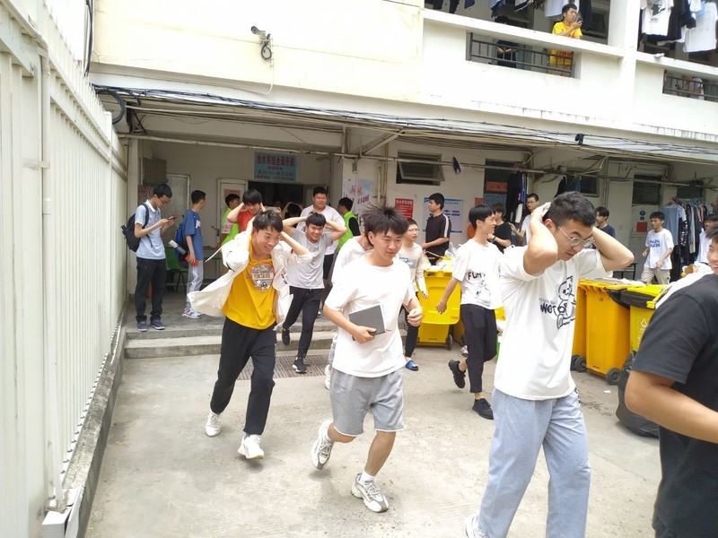 一陣警報聲拉開了演練的序幕,本次演練主要包括避險、疏散兩個流程。演練開始后,全體同學(xué)在班委的組織下,迅速就地進(jìn)行應(yīng)急避險。在收到緊急避險結(jié)束立即疏散的指令后,大家迅速有序地從教室、宿舍撤離,沿著規(guī)劃好的路線迅速撤離,抵達(dá)指導(dǎo)避難點。