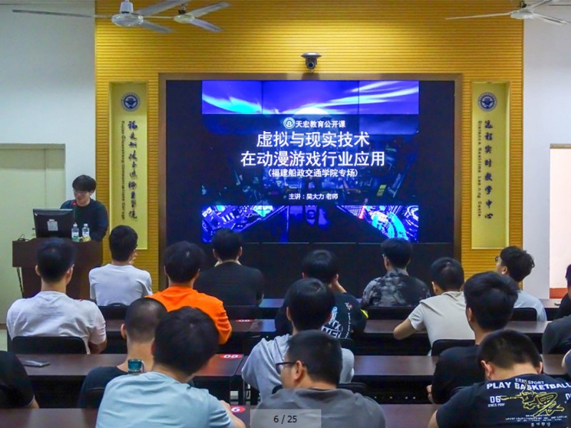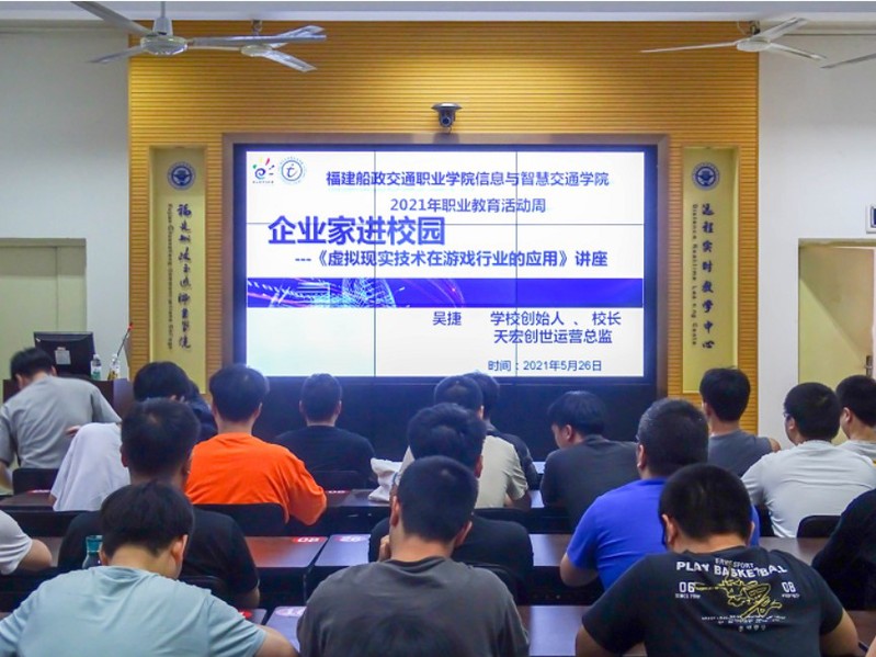 講座由福州天宏創(chuàng)世文化傳播股份有限公司運營總監(jiān)吳捷分別從行業(yè)動態(tài)分析、行業(yè)數(shù)據(jù)分享、行業(yè)技術(shù)要求、技術(shù)案例分享等方面為我院學子做了以“虛擬現(xiàn)實應用技術(shù)在游戲行業(yè)的應用”為主題的分享。