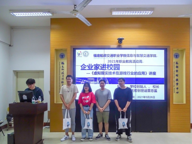 為積極響應習近平總書記對職業(yè)教育工作作出的一系列重要指示,同時進一步推動優(yōu)秀企業(yè)文化進校園,創(chuàng)新方式方法,促進我院學生對專業(yè)知識的運用,拓展我院與企業(yè)合作的新途徑,信息與智慧交通學院于2021年5月26日下午在2號樓舉辦了職業(yè)教育周“企業(yè)文化進校園”《虛擬現(xiàn)實應用技術(shù)在游戲行業(yè)的應用》講座。講座由信息與智慧交通學院副院長陳自力、分團委負責人沈曉家老師主持,學院黨委副書記陳宜大,相關(guān)職能部門負責人,虛擬現(xiàn)實技術(shù)運用專業(yè)同學75余名師生代表參加了本次講座。