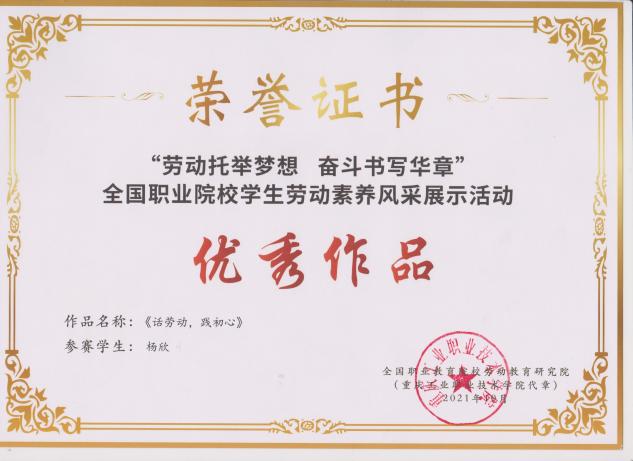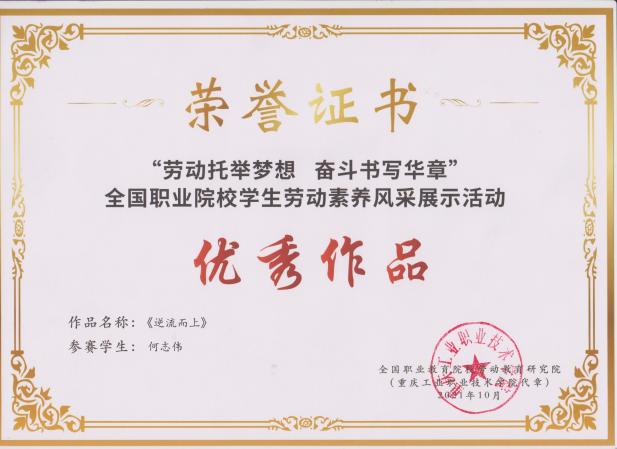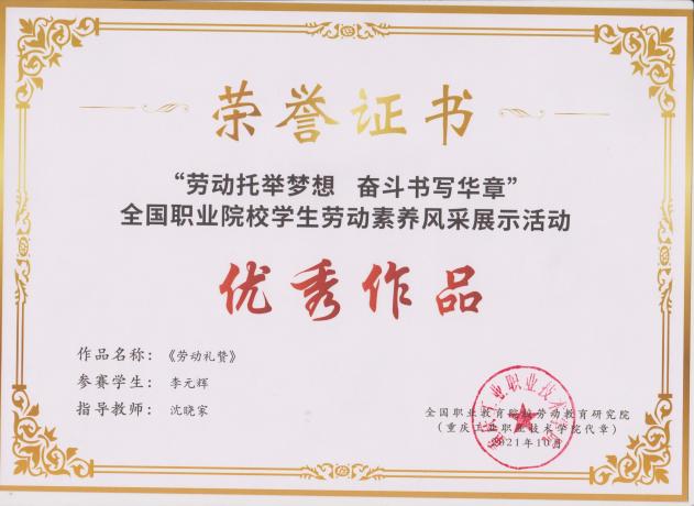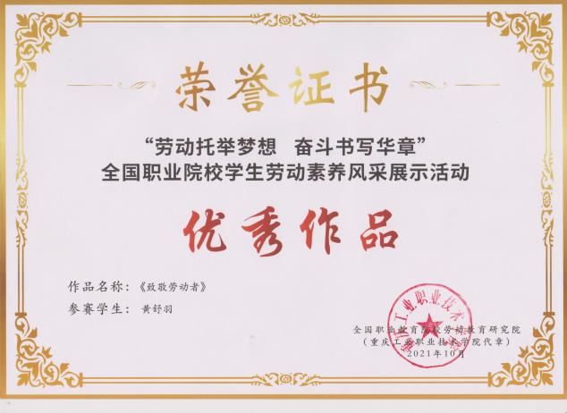 近日,由全國職業(yè)院校勞動(dòng)教育研究院主辦的第一屆全國職業(yè)院校學(xué)生勞動(dòng)素養(yǎng)風(fēng)采展示活動(dòng)獲獎(jiǎng)作品揭曉。我院2019級(jí)計(jì)算機(jī)網(wǎng)絡(luò)技術(shù)3班何志偉同學(xué)的作品《逆流而上》,2020級(jí)計(jì)算機(jī)應(yīng)用技術(shù)1班黃舒羽同學(xué)的作品《致敬勞動(dòng)者》、2020級(jí)計(jì)算機(jī)應(yīng)用技術(shù)3班楊欣同學(xué)的作品《話勞動(dòng) 踐初心》、2020級(jí)軟件技術(shù)1班李元輝同學(xué)的作品《勞動(dòng)禮贊》被評(píng)為優(yōu)秀作品。