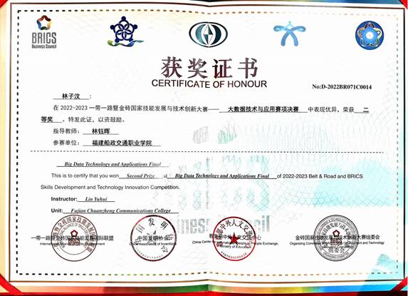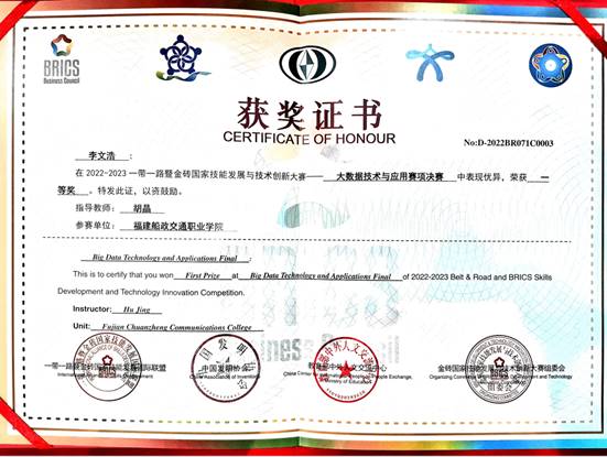 2022一帶一路暨金磚國際技能發(fā)展與技術(shù)創(chuàng)新大賽——大數(shù)據(jù)技術(shù)與應(yīng)用賽項于2023年3月6日在瀘州職業(yè)技術(shù)圓滿落幕,我校信息與智慧交通學(xué)院的李文浩、林子汶2位同學(xué)在胡晶和林鈺暉2位老師的指導(dǎo)下分別斬獲一等獎和二等獎的好成績。