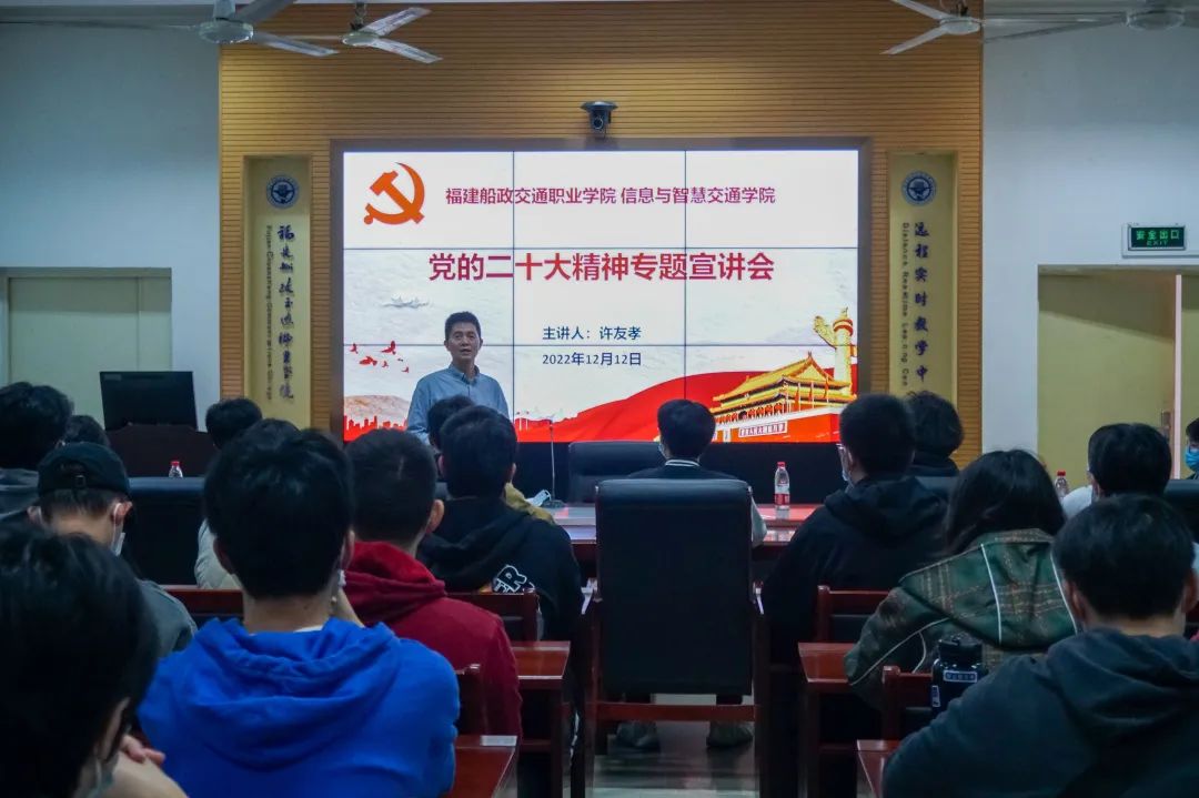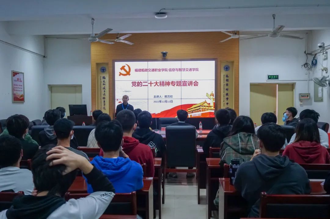 為進(jìn)一步深入學(xué)習(xí)貫徹黨的二十大精神,持續(xù)掀起全院師生學(xué)習(xí)貫徹黨的二十大精神的熱潮,推動(dòng)黨的二十大精神入腦入心、走深走實(shí),信息與智慧交通學(xué)院于12月12日在福道園自強(qiáng)樓2-1教室召開(kāi)學(xué)習(xí)黨的二十大精神專(zhuān)題宣講會(huì)。專(zhuān)題宣講會(huì)分別由學(xué)院黨總支書(shū)記許友孝、院長(zhǎng)賴(lài)萬(wàn)欽主講,全體輔導(dǎo)員和21、22級(jí)各班長(zhǎng)、團(tuán)支書(shū)、入黨積極分子參加了本次宣講會(huì)。