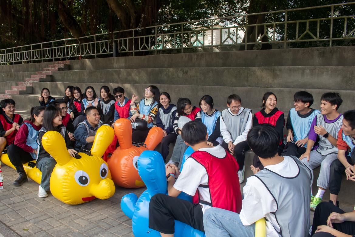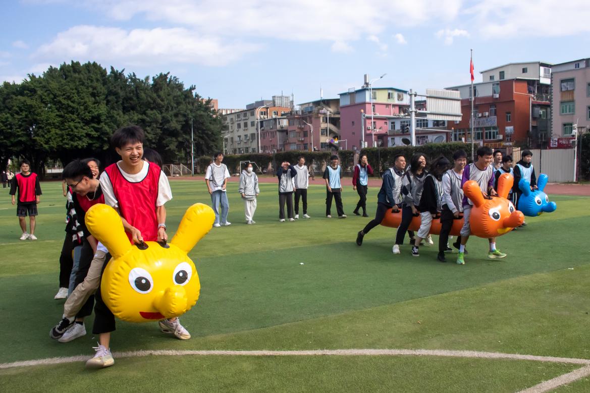 分為五大組,每一輪各組出2人,背夾氣球,步調(diào)一致向前走,繞過(guò)轉(zhuǎn)折點(diǎn)回到起點(diǎn),下一小組兩人開(kāi)始前進(jìn)。向前走時(shí),雙手不能碰到球,否則一次罰2秒;球掉后從起點(diǎn)重新開(kāi)始游戲。先完成者勝出。