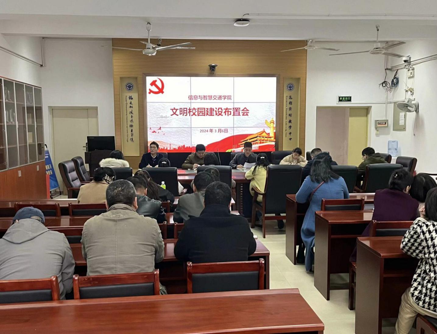 為進一步貫徹落實學校第三屆省級文明校園實地考察迎檢工作任務(wù)部署和工作要求,3月6日下午,信息與智慧交通學院在福道園自強樓2-1會議室召開文明校園建設(shè)布置會,部署安排近期重點工作。信息與智慧交通學院全體教職工參加會議。
