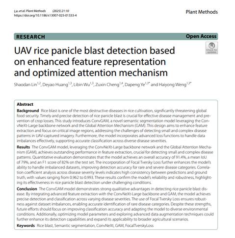 近日,福建農(nóng)林大學農(nóng)業(yè)人工智能中心與福建船政交通職業(yè)學院信息與智能交通學院的研究團隊合作,成功開發(fā)了一種基于無人機圖像的高精度水稻穗瘟病檢測模型——ConvGAM。該研究成果已發(fā)表在《Plant Methods》期刊(JCR 1區(qū),SCI 2區(qū))上,題為《UAV rice panicle blast detection based on enhanced feature representation and optimized attention mechanism》。