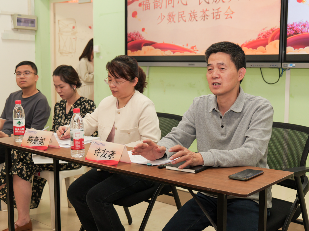 隨著茶話會(huì)緩緩拉開帷幕,黨支部書記許友孝發(fā)表了熱情洋溢的開場(chǎng)致辭。他首先對(duì)到場(chǎng)的各族學(xué)生致以熱烈的歡迎,并在會(huì)議過(guò)程中,多次鼓勵(lì)各民族同學(xué)敞開心扉、暢所欲言,盡情分享在學(xué)校的精彩經(jīng)歷,大膽提出遇到的困難。同學(xué)們熱情高漲,積極參與,主動(dòng)投入互動(dòng)環(huán)節(jié),依次闡述自己的觀點(diǎn)和需求。領(lǐng)導(dǎo)們則專注地傾聽每位同學(xué)的發(fā)言,不時(shí)點(diǎn)頭以示贊同,并與同學(xué)們進(jìn)行了友好的交流,對(duì)提出的問(wèn)題給予了耐心細(xì)致的解答和反饋,整個(gè)場(chǎng)面洋溢著活躍的氣氛,秩序井然。