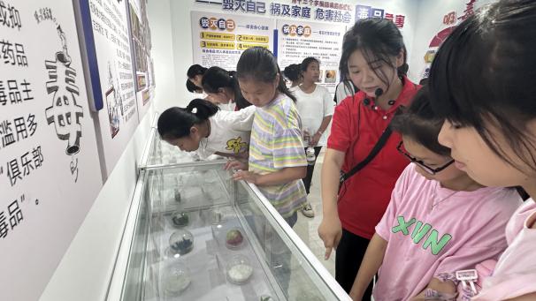 在泰寧縣禁毒教育展廳,踐行團(tuán)成員化身為“禁毒宣講員”,帶領(lǐng)孩子們近距離觀察仿真毒品樣本,解讀毒情數(shù)據(jù)看板。通過玻璃展柜里的“偽裝陷阱”、墻上觸目驚心的案例,將抽象的禁毒知識具象化。當(dāng)孩子們踮起腳尖辨認(rèn)“彩色糖果”般的新型毒品時,防毒拒毒的安全意識已實(shí)現(xiàn)有效滲透——這是實(shí)踐團(tuán)在“三下鄉(xiāng)”活動中,為鄉(xiāng)土青少年構(gòu)建安全防護(hù)體系的重要實(shí)踐縮影。