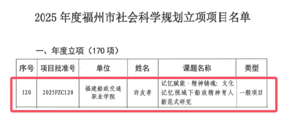 根據(jù)《福州市社會科學規(guī)劃項目管理辦法》,經專家組評審,市社科規(guī)劃領導小組審議通過,2025年度福州市社會科學規(guī)劃共立項281個項目,其中我院許友孝老師申報的《記憶賦能·精神鑄魂:文化記憶視域下船政精神育人新范式研究》獲批立項。