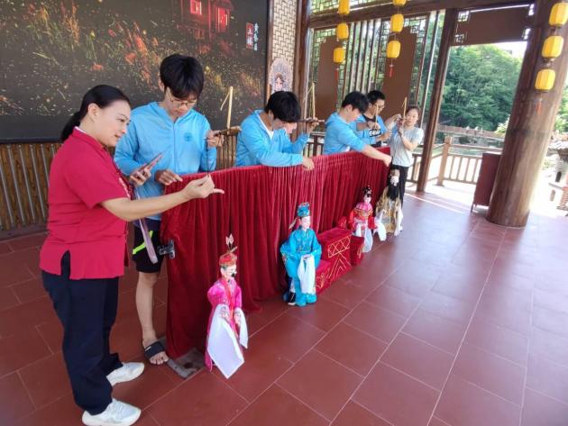 暮色之中,傳承團前往木偶戲戲臺學習提線木偶。在觀看了一場精彩的《拜壽》戲曲后,成員們躍躍欲試,開始對提線木偶技藝進行初步嘗試。細繩纏繞指尖,輕拉慢放間,木偶仿佛被注入了生命,輕輕顫動。成員們?nèi)褙炞?,一絲不茍地模仿師傅的動作,盡管手法尚顯生疏,卻難掩對這門古老藝術(shù)的敬畏與熱愛。在這靜謐與靈動交織的瞬間,傳統(tǒng)技藝的種子悄然播撒心田,激發(fā)起成員們傳承與創(chuàng)新的責任感。