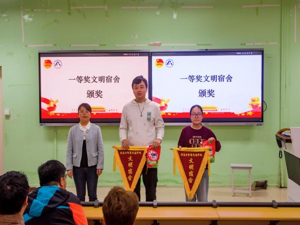 本次活動自10月中旬啟動,全院在校同學(xué)積極參與,綜合宿舍文化、遵規(guī)守紀(jì)、衛(wèi)生狀況等方面擇優(yōu)評選出15間學(xué)院”文明宿舍”。儀式上,主持人介紹了本次活動的目的和意義,宣讀了獲獎宿舍名單。柳燕妮副書記和參會輔導(dǎo)員老師們?yōu)楂@獎宿舍頒獎。