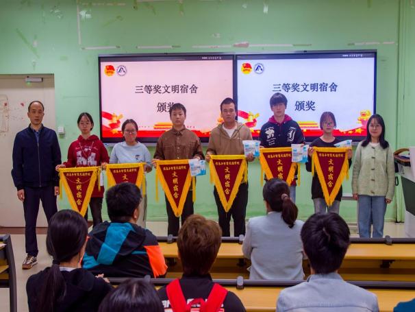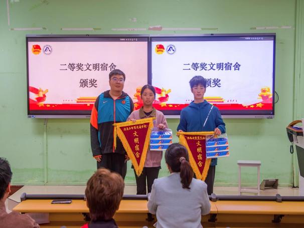 柳燕妮副書記向受表彰宿舍同學(xué)表示了祝賀。她希望同學(xué)們以先進(jìn)為榜樣,從保持宿舍干凈整潔做起,將文明修養(yǎng)內(nèi)化于心;同時不斷強(qiáng)化擔(dān)當(dāng)意識,共建溫暖集體,把文明熱情轉(zhuǎn)化為學(xué)習(xí)成長動力,積極展現(xiàn)新時代大學(xué)生的青春風(fēng)采。