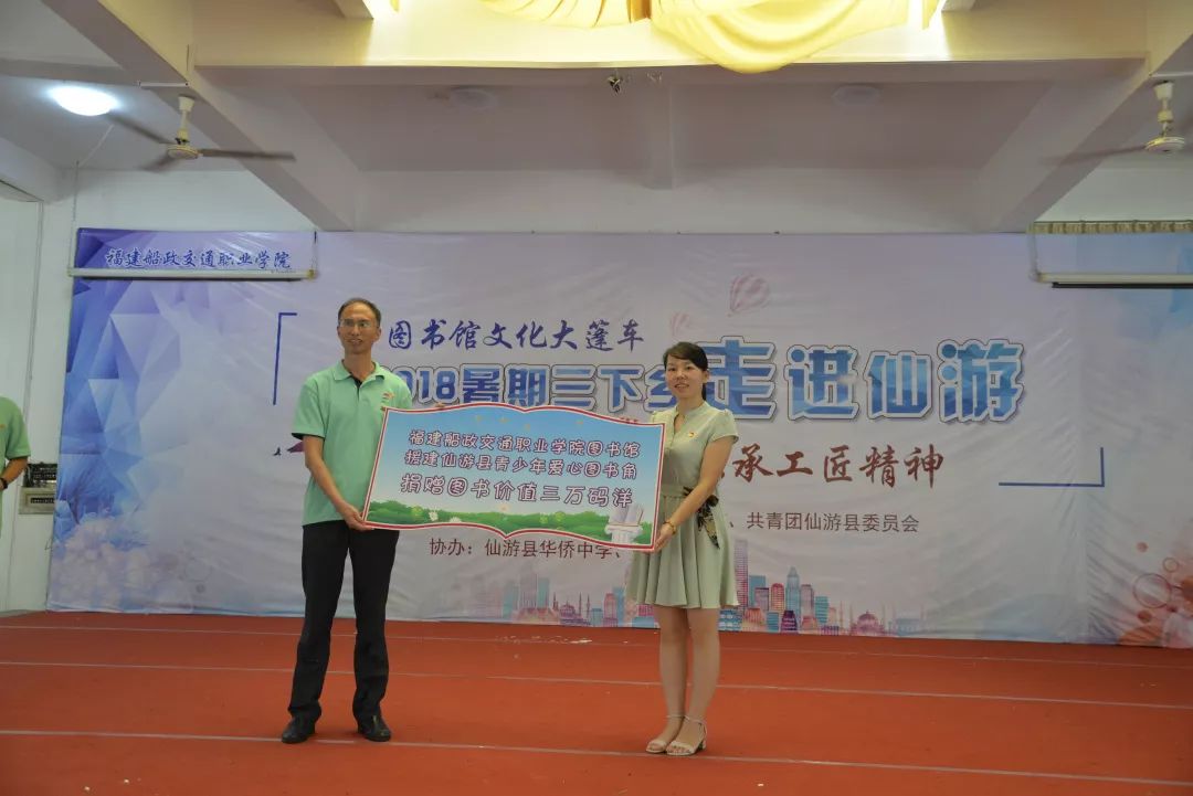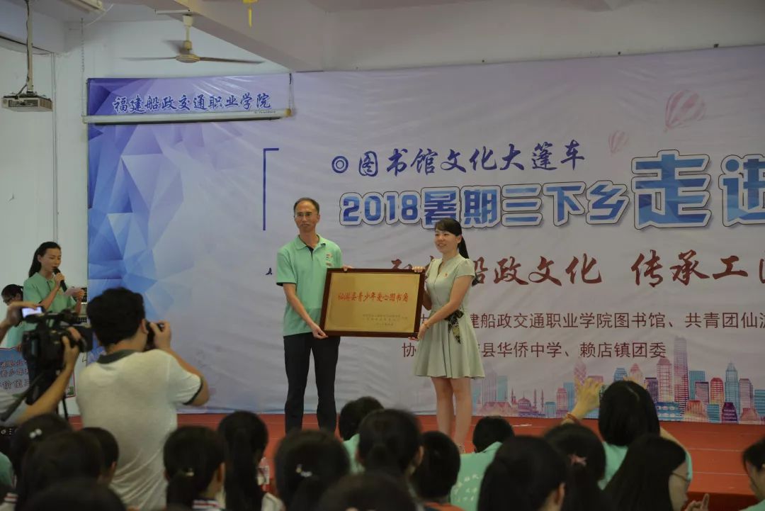 活動當(dāng)天,福建船政交通職業(yè)學(xué)院圖書館陳家越館長現(xiàn)場為援建的仙游團縣委青少年愛心圖書角授牌,仙游團縣委書記陳麗君代表團縣委接受了愛心圖書角牌匾,并捐贈價值三萬元新書及愛心漂流圖書。