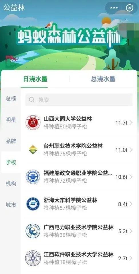 2.打開支付寶app,點擊螞蟻森林進(jìn)入公益林板塊,搜索“福建船政交通職業(yè)學(xué)院公益林”