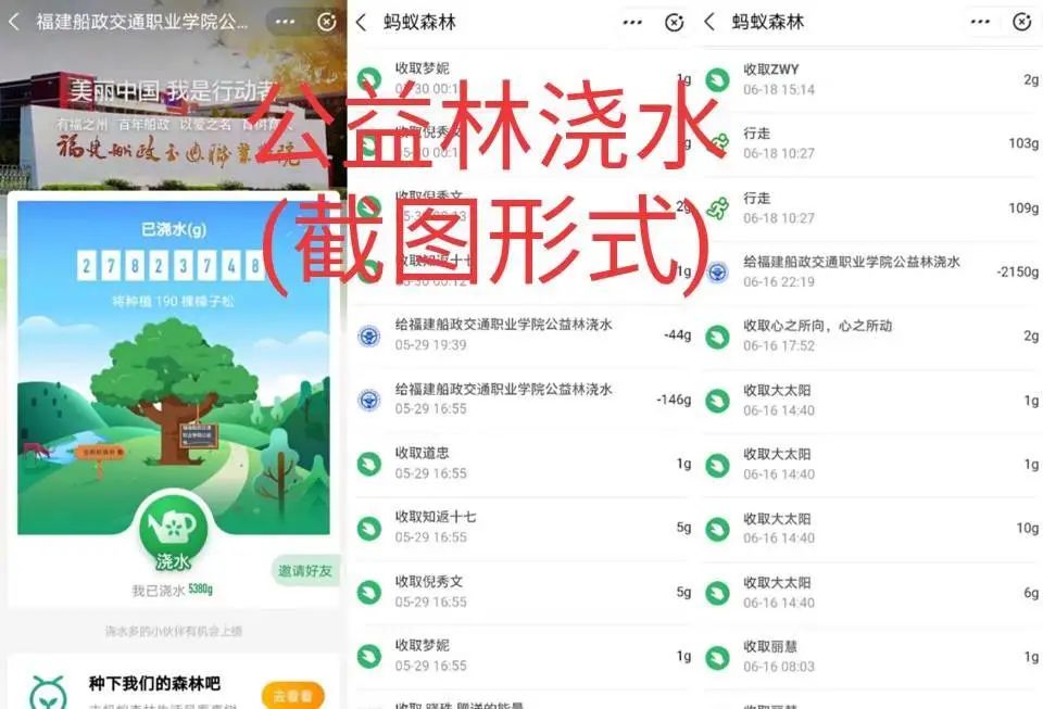 登錄三全育人平臺搜索“船政公益林澆水7/8/9月活動”活動,點擊“立即報名”,選擇報名信息“個人”后,上傳在7/8/9月為每個月學(xué)校公益林澆水量不少于5000g的截圖即可獲得三全育人“校園活動”模塊1積分哦,10000g可獲得2積分以此類推,每人兌換上限為10積分。大家在標(biāo)題需要備注:學(xué)院班級姓名學(xué)號,截圖需要截到日期噢~