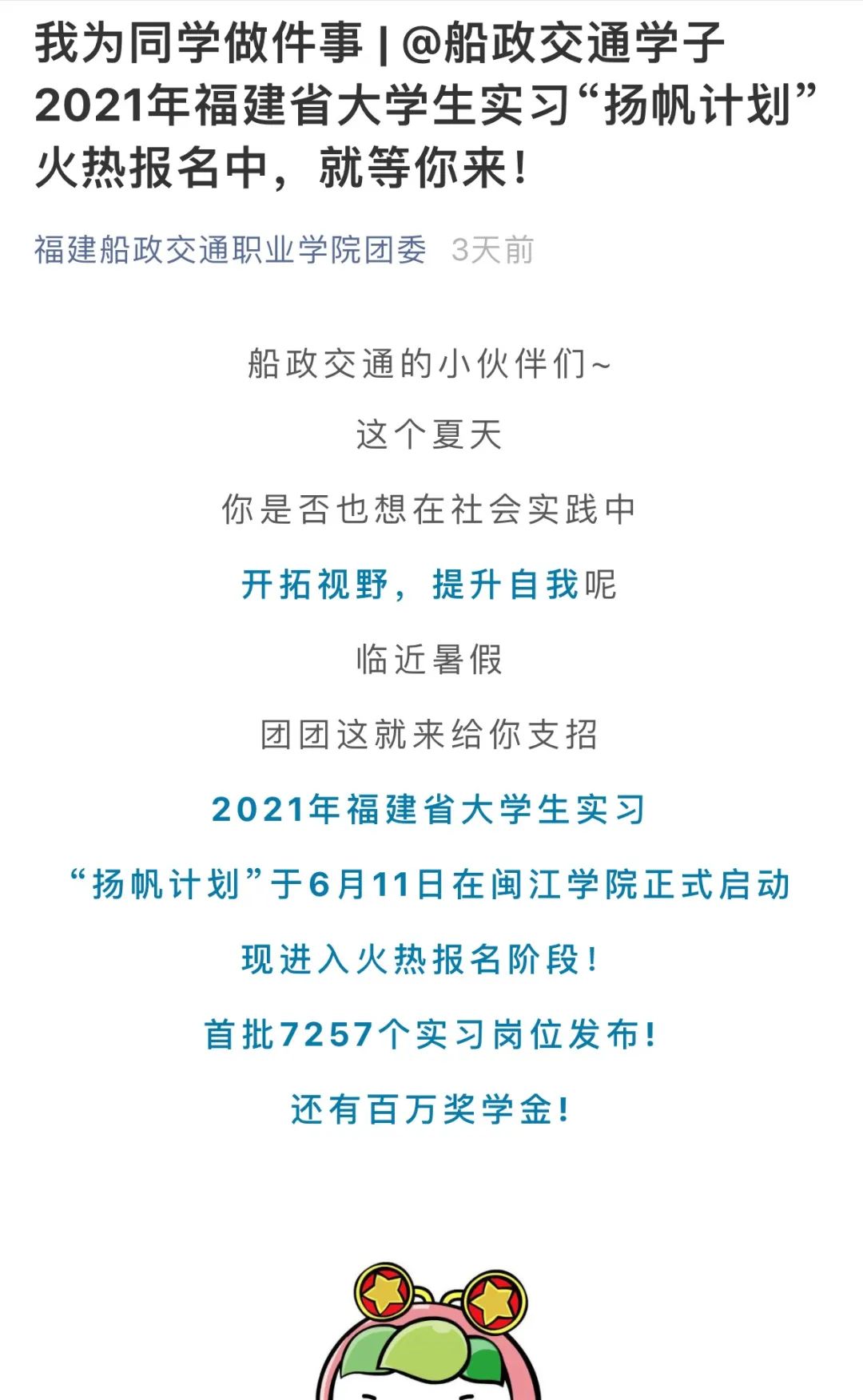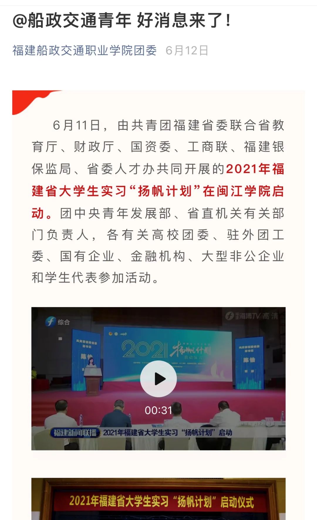2021年福建省大學(xué)生實(shí)習(xí)“揚(yáng)帆計(jì)劃”已正式啟動,首批7257個實(shí)習(xí)崗位發(fā)布,現(xiàn)已進(jìn)入火熱報(bào)名階段,為切實(shí)幫助船政交通學(xué)子認(rèn)識、了解、參與“揚(yáng)帆計(jì)劃”,準(zhǔn)確定位自己喜歡的實(shí)習(xí)崗位,在社會實(shí)踐中開拓視野,提升自我,校學(xué)生會及時推送和轉(zhuǎn)發(fā)大學(xué)生實(shí)習(xí)“揚(yáng)帆計(jì)劃”相關(guān)報(bào)道,傳遞最新最快崗位信息。