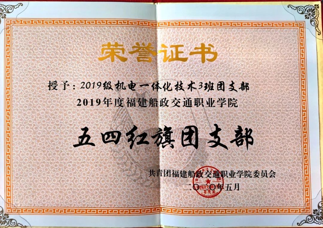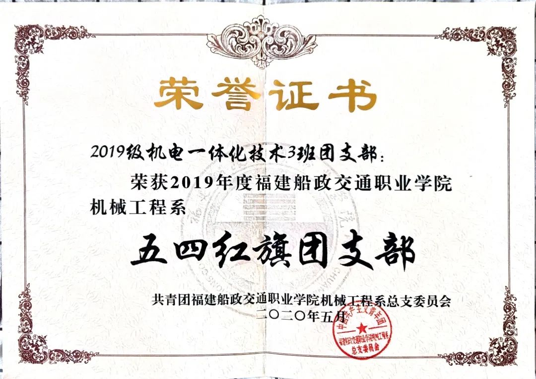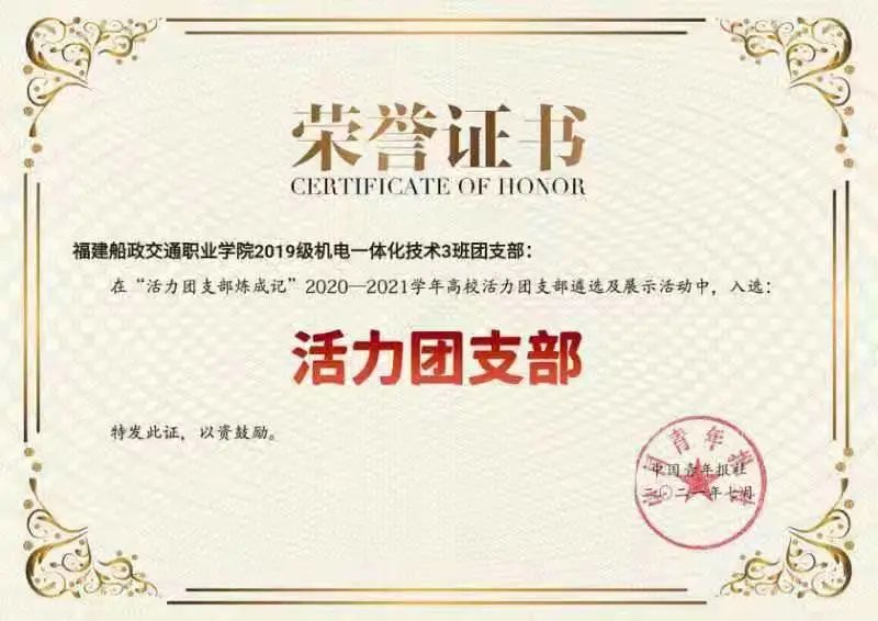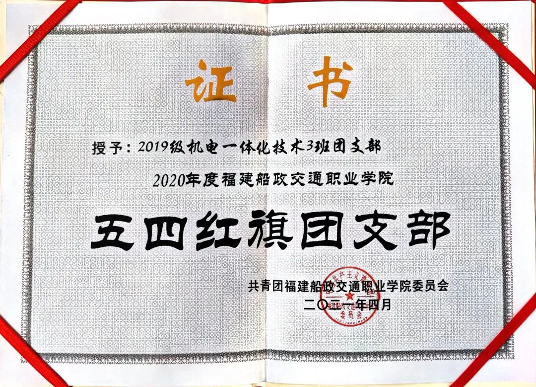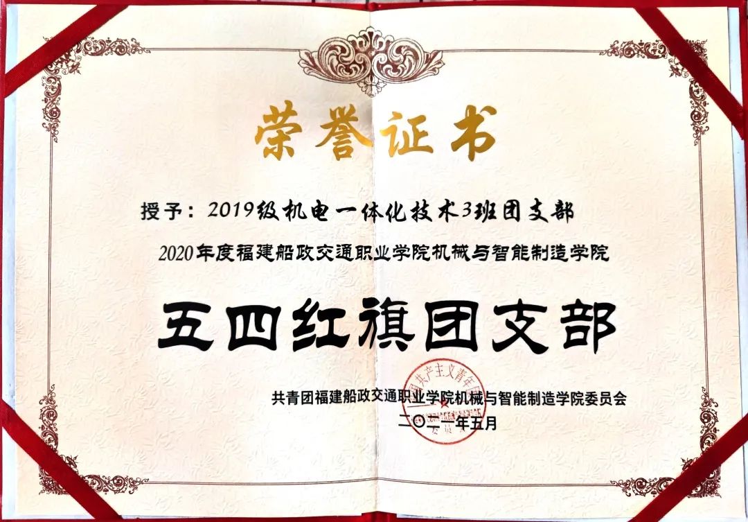 2020、2021連續(xù)兩年被共青團(tuán)福建船政交通職業(yè)學(xué)院委員會(huì)及共青團(tuán)福建船政交通職業(yè)學(xué)院機(jī)械工程系總支委員會(huì)評(píng)為五四紅旗團(tuán)支部;2020年12月被福建船政交通職業(yè)學(xué)院評(píng)為文明班級(jí);2021年5月被共青團(tuán)福建船政交通職業(yè)學(xué)院機(jī)械與智能制造學(xué)院委員會(huì)評(píng)為優(yōu)秀志愿班集體。