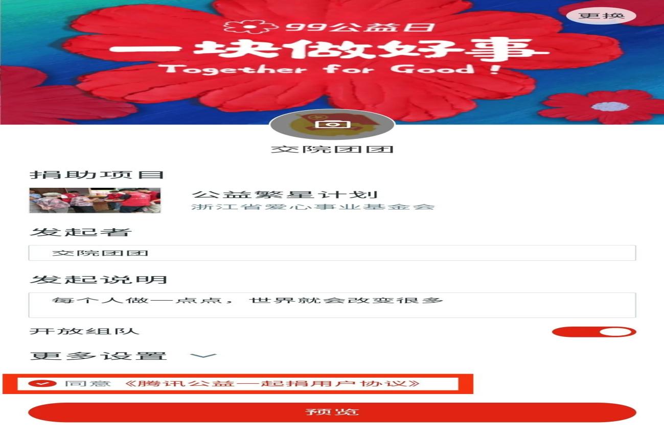 第二步,填寫發(fā)起人、發(fā)起說明等信息,勾選《騰訊公益一起捐用戶協議》后,進入預覽界面。
