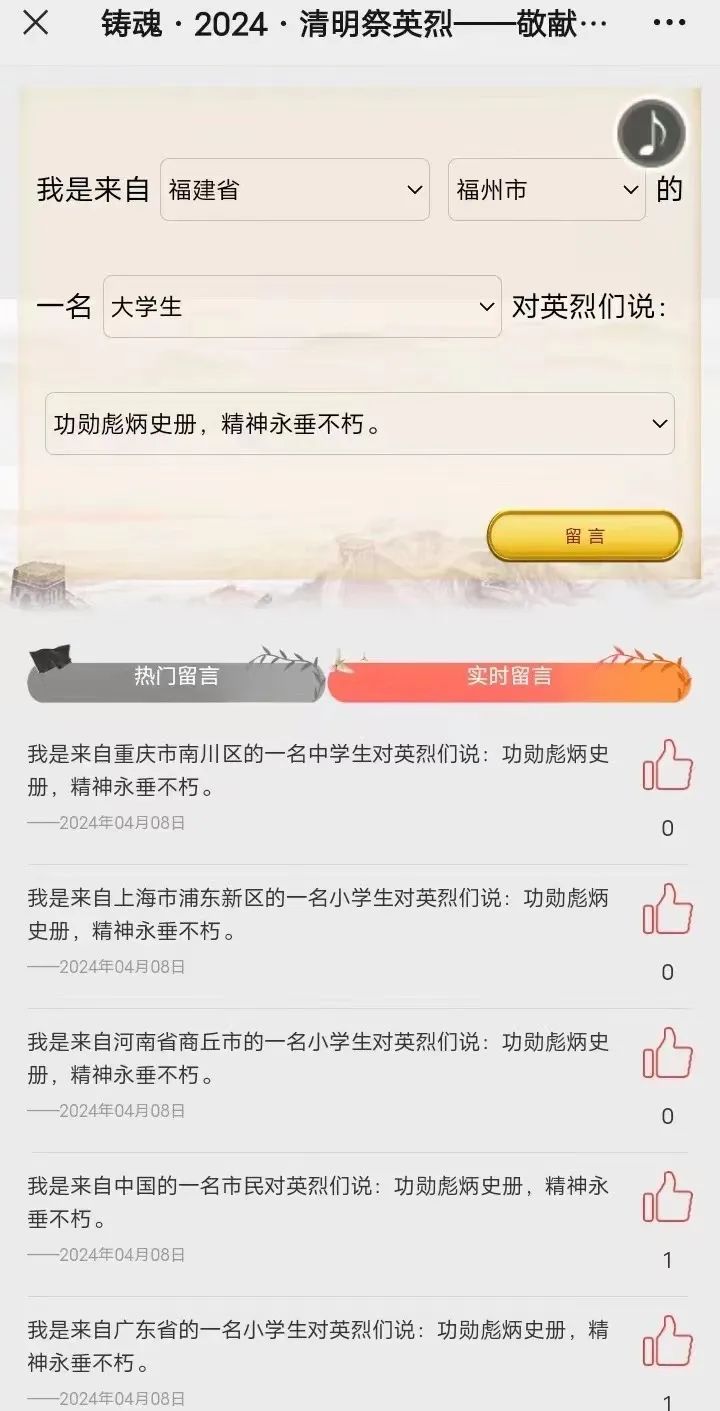 為進(jìn)一步增進(jìn)我院廣大學(xué)生繼承和弘揚(yáng)革命英烈的精神,培養(yǎng)大學(xué)生愛國意識,經(jīng)濟(jì)與管理學(xué)院于2024年4月4日開展“祭奠革命英烈,傳承紅色精神”網(wǎng)絡(luò)寄語活動。
